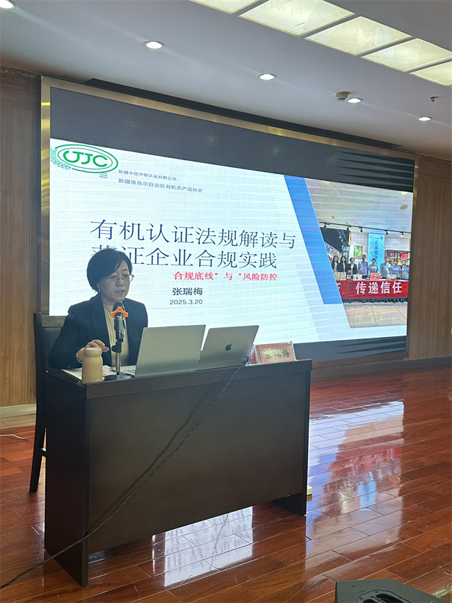 培训首日,新疆有机农产品协会会长、新疆中信中联认证有限公司总经理张瑞梅以《有机认证法规与合规实践》为题展开权威解读。通过全国及新疆特色农产品认证典型案例解析,系统梳理由GB/T 19630标准到《有机产品认证管理办法》的法规脉络。特别聚焦生产端、认证端和销售端风险预警体系,通过“政策条文+实证案例”的双轨教学,帮助学员构建起“认证全流程-风险控制点-解决方案”的立体知识框架。
