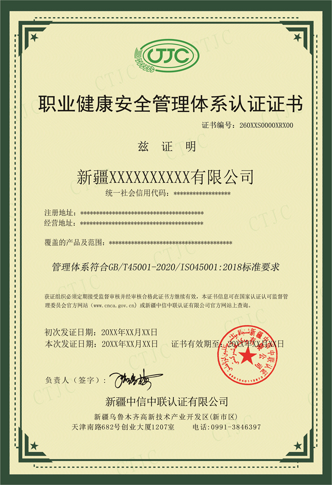 中信中联-职业健康安全管理体系证书模版